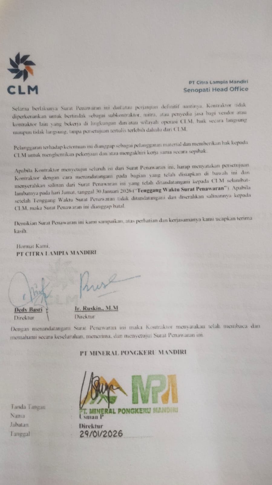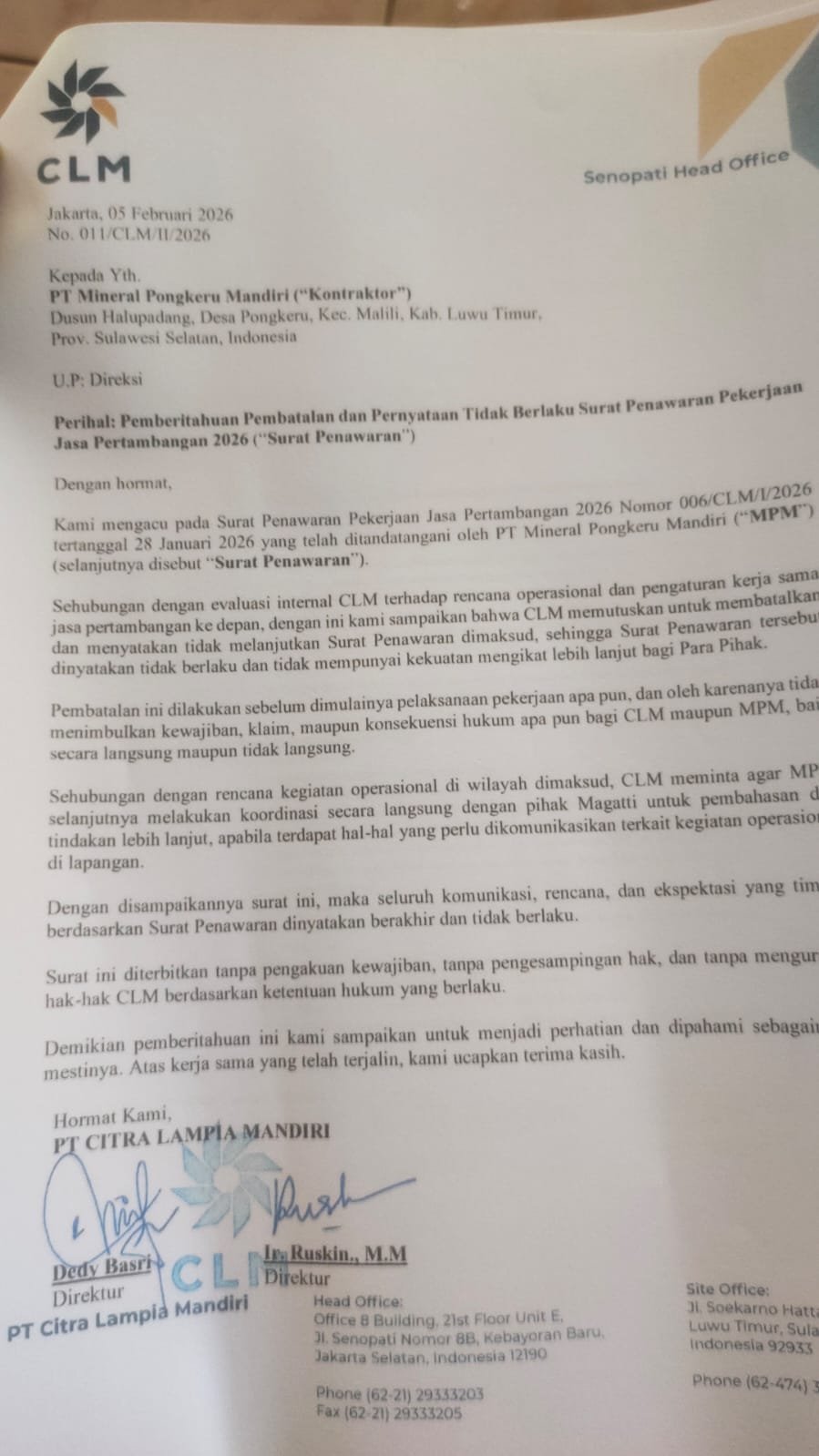 Syahrir meminta manajemen PT CLM segera mencabut surat pembatalan tersebut dan kembali mengacu pada perjanjian awal yang telah disepakati bersama PT MPM. Menurutnya, tindakan sepihak tersebut berpotensi merugikan perusahaan serta menciptakan ketidakpastian kerja sama di sektor jasa pertambangan.